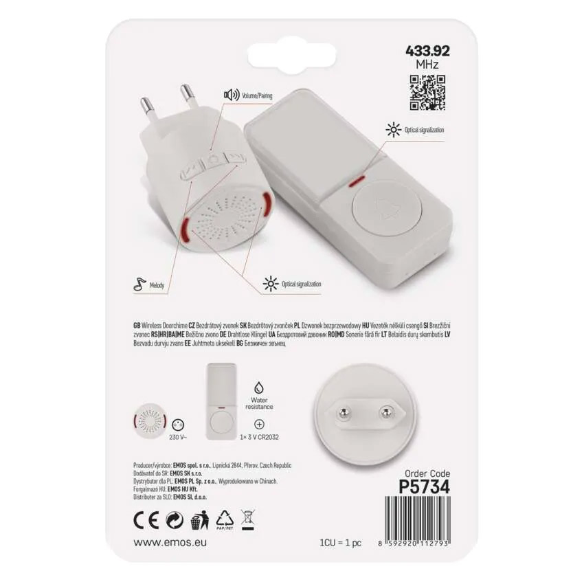 način prenosa: bežično zvono, optička signalizacija zvonjenja, domet tipke: 150 m, broj melodija: 10, način uparivanja: automatsko self-learning, optičko signaliziranje na tipki, mogućnost dodavanja dodatne tipke, maks. 8, dodatna (rezervna) tipka: P5734T, vodootporna tipka IP56, napajanja tipke: 1× 3V CR2032 (uključeno u pakovanje), napajanje glavne jedinice: 230V AC, 5 nivoa jačine zvuka, jačina zvona 85dB, prenosna frekvencija 433 MHZ boja: bela, dimenzije zvonca: 72 x 42 x 42 mm, dimenzije tipke: 19 × 38 × 92 mm, blister, garancija: 2 godine