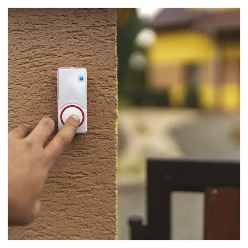 bežično zvono: 1 spoljna tipka 2 unutrašnja zvonca, crveno bela boja, optička signalizacija na tipki i zvonjenja, domet tipke: 150 m, broj melodija: 10, način uparivanja: automatsko self-learning, mogućnost dodavanja dodatne tipke, maks. 8, dodatna (rezervna) tipka: P5729T, vodootporna tipka IP44, napajanje glavne jedinice: 230V AC, 5 nivoa jačine zvuka, jačina zvona 110 dB, prenosna frekvencija 433 MHZ, dimenzije zvonca: 66 x 57 x 107 mm, dimenzije tipke: 24 × 90 × 40 mm, blister, garancija: 2 godine