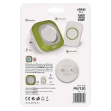 bežično zvono, zelena boja, optička signalizacija zvonjenja, domet tipke: 150 m, broj melodija: 36, način uparivanja: automatsko self-learning, optičko signaliziranje na tipki, mogućnost dodavanja dodatne tipke, maks. 8, dodatna (rezervna) tipka: P5723T, vodootporna tipka IP44, napajanja tipke: 1× 3V CR2032 (uključeno u pakovanje), napajanje glavne jedinice: 230V AC, 4 nivoa jačine zvuka, jačina zvona 110 dB, prenosna frekvencija 433 MHZ, dimenzije zvonca: 74 x 74 x 74 mm, dimenzije tipke: 17 × 40 × 60 mm, blister, garancija: 2 godine