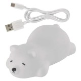 Noćna lampa punjiva u obliku medvedića, izvor svetlosti: SMD LED, svetlosni tok: 20lm i 3m, napajanje: Li-Ion baterija 3,7V/1200mAh, boja svetlosti: topla bela/multicolor, režimi: SMD LED 50 %, SMD LED 100 %, SMD LED multicolor, prekidač: da, automasko uključenje/isključenje, tajmer: 30 minuta, dimenzije: 155 × 85 × 69 mm, težina: 189 gr, garancija: 2 godine